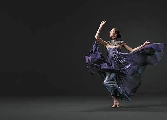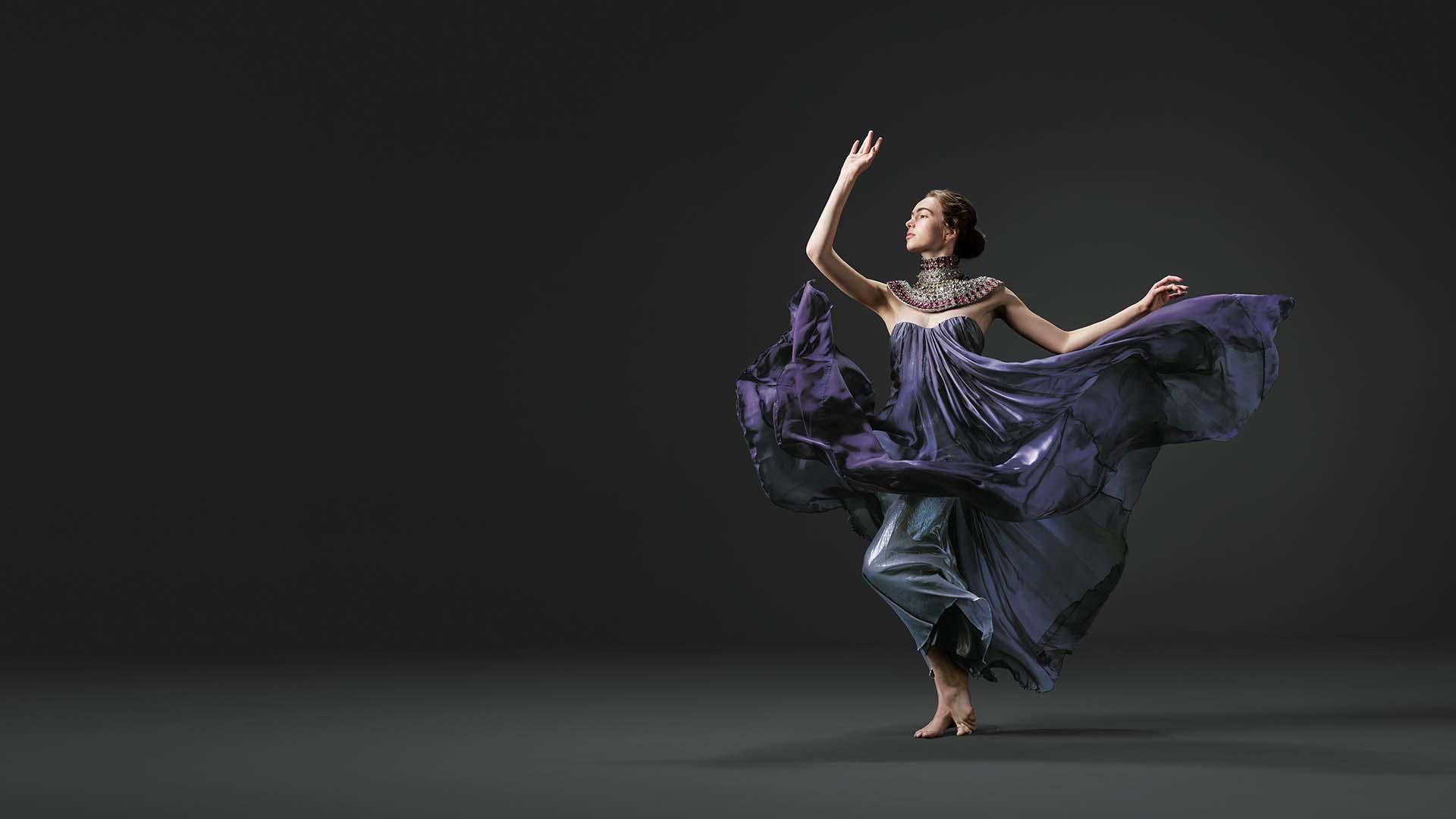 条裙子在丝绸雪纺上缀连着紫水晶,下层是一层闪亮的灰银丝布。它强烈的简朴特征来源于拜占庭的胸甲,这种胸甲上有刺绣的金色流苏,还有椭圆形的紫水晶和蓝黄玉装饰。