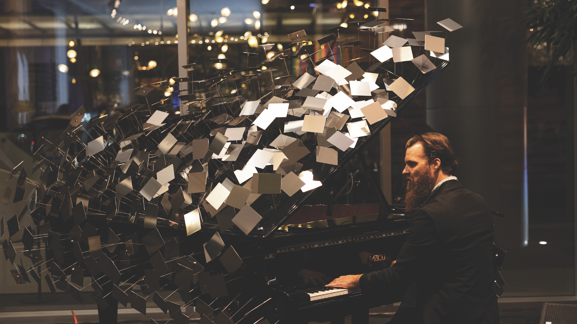 SO 用令人惊叹的 450 个镜子(100 毫米 x 100 毫米 x 1 毫米)覆盖了这台令人难以置信的杰作。镜子安装在不同长度的 2.5 毫米钢杆上,并向多个方向偏转。所追求的效果模仿了云朵的飘逸外观和运动。这些镜子代表了建筑物的大方形面板,并且像塔一样,钢琴的外观根据观看角度的不同而发生巨大变化。完成后,镜子被小心地拆除,以便将云上的法奇奥里运送到温哥华。打开包装后,技术人员花了近 2 天的时间来安装镜子。
