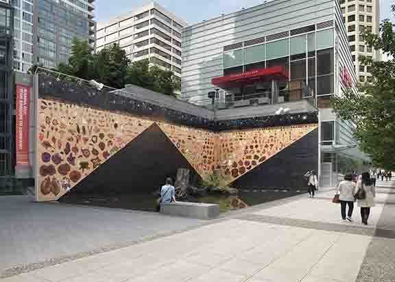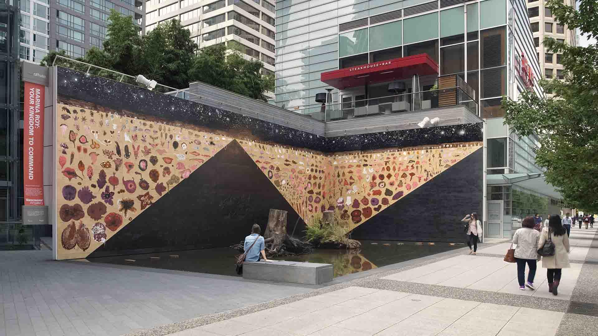 arina Roy uses both natural and processed materials to create a 25 meter mural and tree fountain that stands out in contrast to the glass and concrete office towers in downtown Vancouver. Using a tree salvaged after the 2015 windstorm to build a fountain, and background plywood mural painted with bitumen, made from tar and shellac, cultivated by the female lac bug, Roy’s installation "Your Kingdom to Command" speaks to transformation in nature, largely due to human industry.